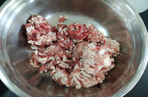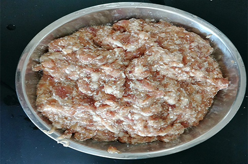原料肉絞肉,絞為4mm左右的肉粒使用